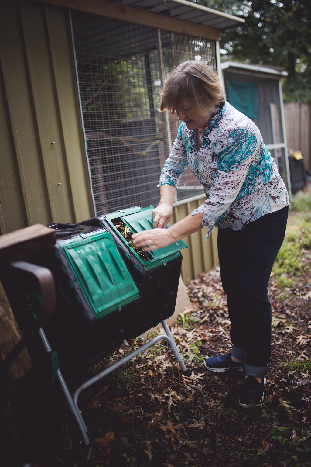 Composting leaves and garden clippings is part of daily life at Shelton-Lea, with dual compost tumblers and garden bags for storage. Two to three cubic metres of compost is produced monthly and used as mulch throughout the garden.